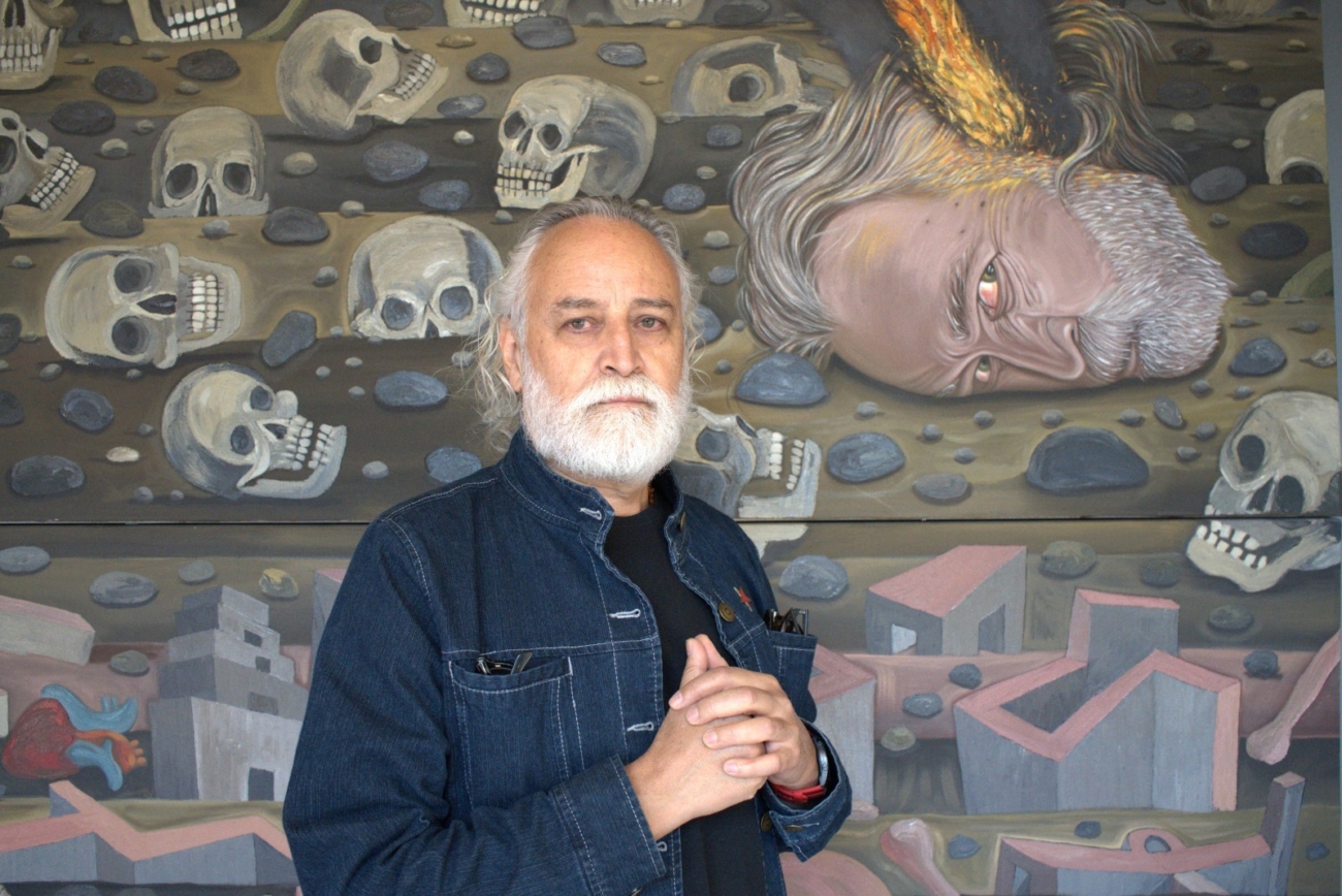 Gustavo Monroy, originario de la Ciudad de México, prolonga el pulso del muralismo del siglo XX, al convertir su trabajo en una resonancia de reflexión y en un llamado al compromiso social. A lo largo de más de cuatro décadas, el artista ha construido una obra que, en sus propias palabras, puede entenderse como una auténtica “bitácora de la violencia” en México. La mayor parte de sus piezas reflejan problemáticas que no solo atraviesan la vida del país, sino que también son universales: migraciones, desapariciones forzadas, masacres, feminicidios, opresión e injusticia.