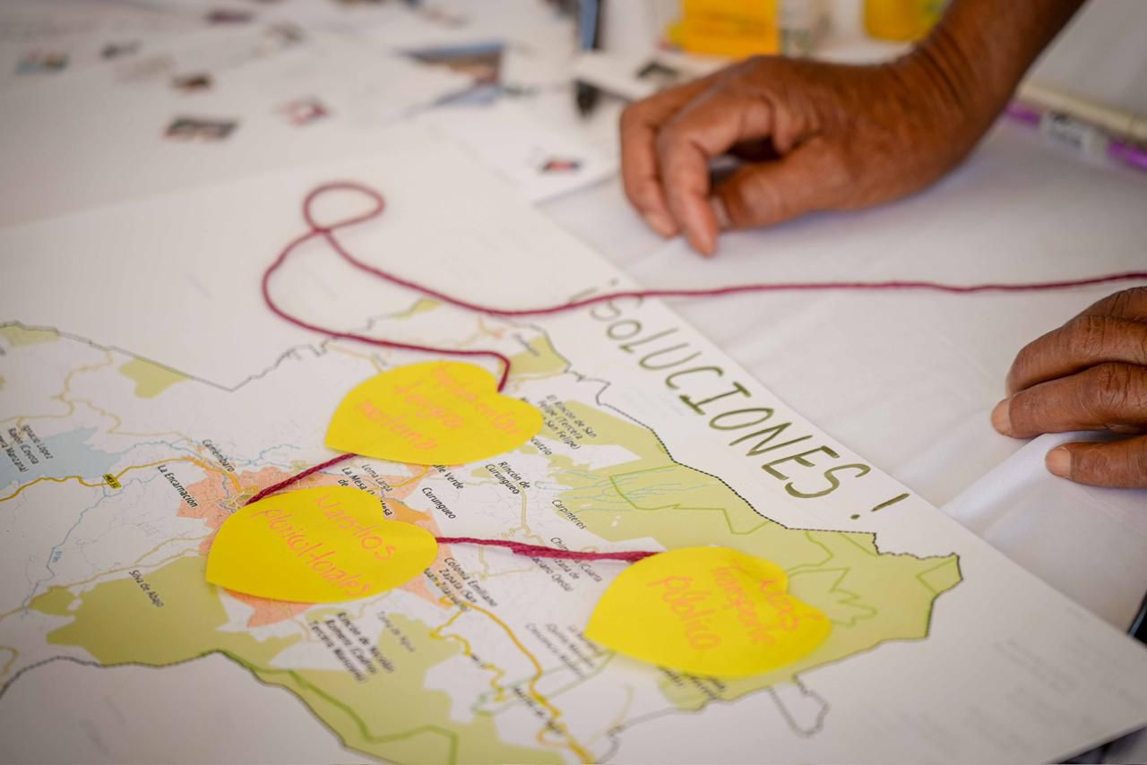 Las mujeres michoacanas utilizaron mapas de su territorio para identificar las deudas históricas con sus comunidades. Entre recortes, dibujos y palabras, las participantes pasaron del diagnóstico a la propuesta.