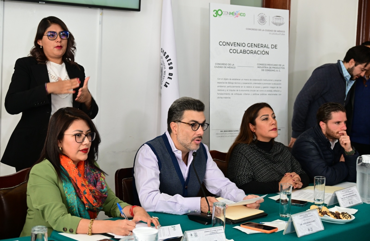 26.02.26. El Congreso de la Ciudad de México y el Consejo Mexicano de la Industria de Productos de Consumo (CONMÉXICO) firmaron hoy un Convenio de Colaboración, con el objetivo de establecer un marco de trabajo conjunto que propicie espacios de diálogo técnico y cooperación en materia de educación ambiental, gestión integral de residuos y adopción de prácticas de economía circular, mediante acciones coordinadas de capacitación, asesoría y comunicación.