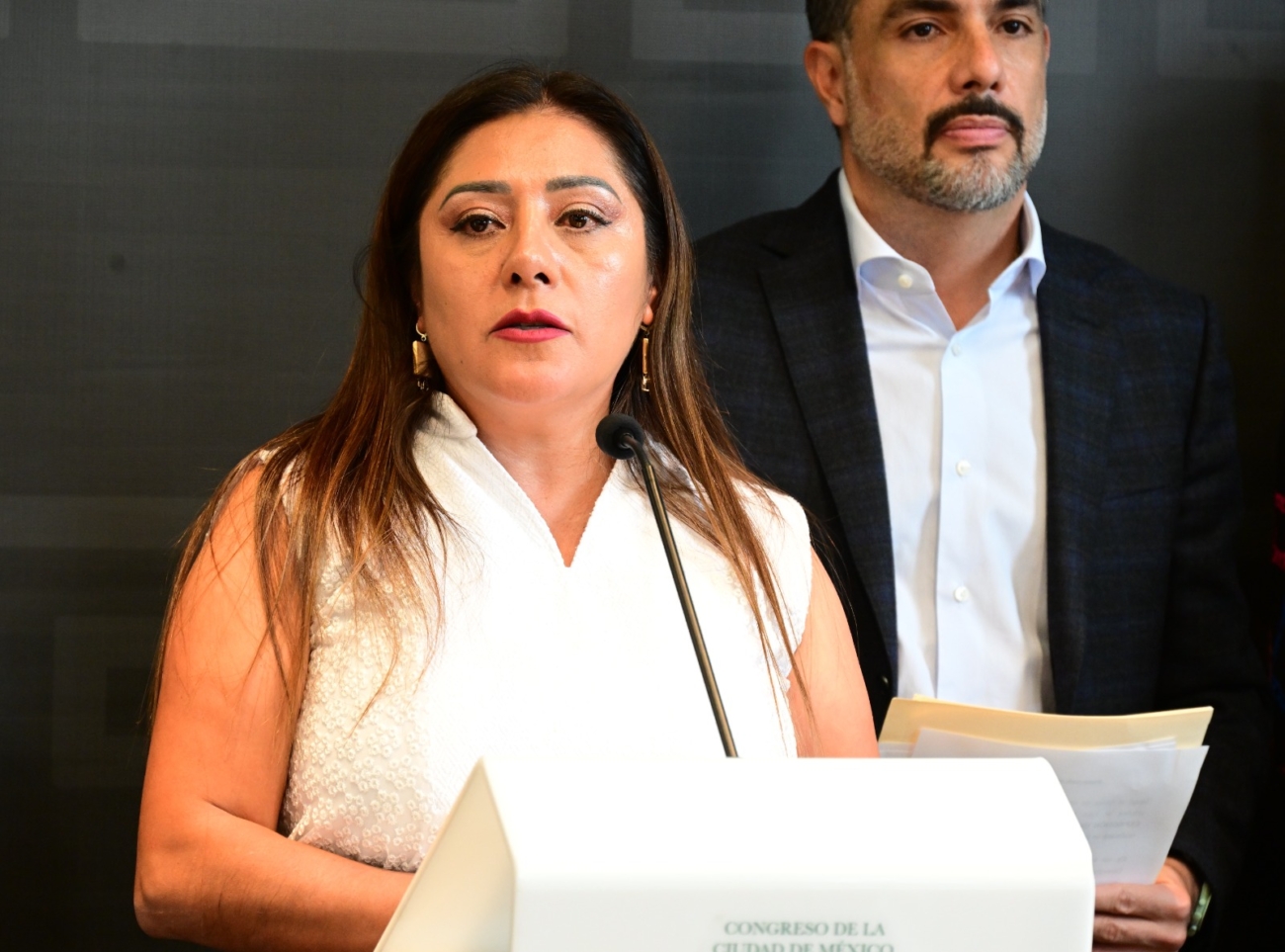 Ciudad de México, a 16 de octubre 2025. En rueda de prensa, en el Congreso capitalino, la coordinadora de Morena en el Congreso de la Ciudad de México, Xóchitl Bravo dijo que se debe abrir el diálogo para proteger la libertad de expresión.