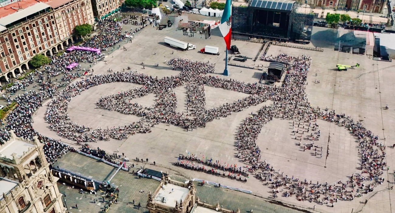 Previo a la inauguración, la plancha del Zócalo se convirtió en un lienzo en la que ciclistas, junto a sus bicis, formaron la imagen de una bicicleta monumental, hecho que reafirmó la lucha y resistencia por una ciudad con movilidad para todas y todos.
