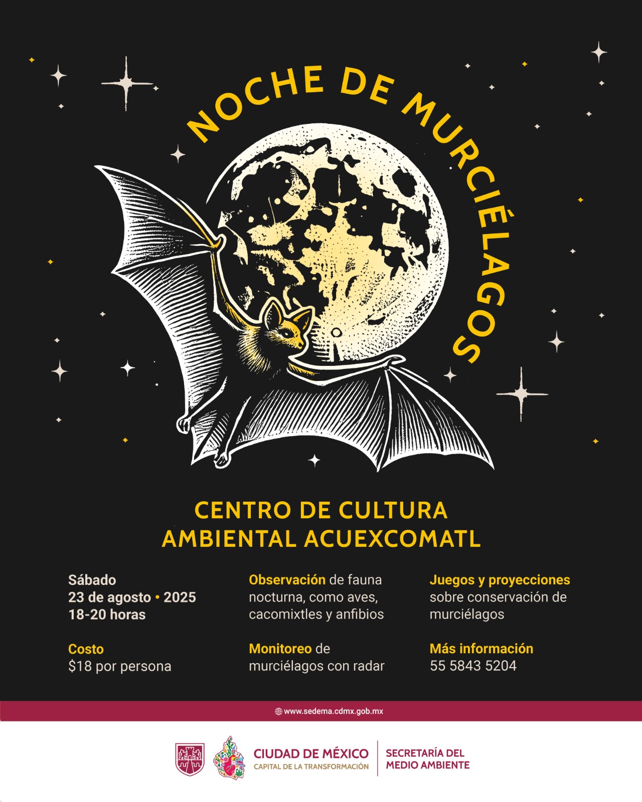 La Secretaría del Medio Ambiente (SEDEMA), a través de la Dirección General de Coordinación de Políticas y Cultura Ambiental (DGCPCA), invita a las y los capitalinos a disfrutar de la “Noche de Murciélagos” en el Centro de Cultura Ambiental (CCA) Acuexcómatl el sábado 23 de agosto.