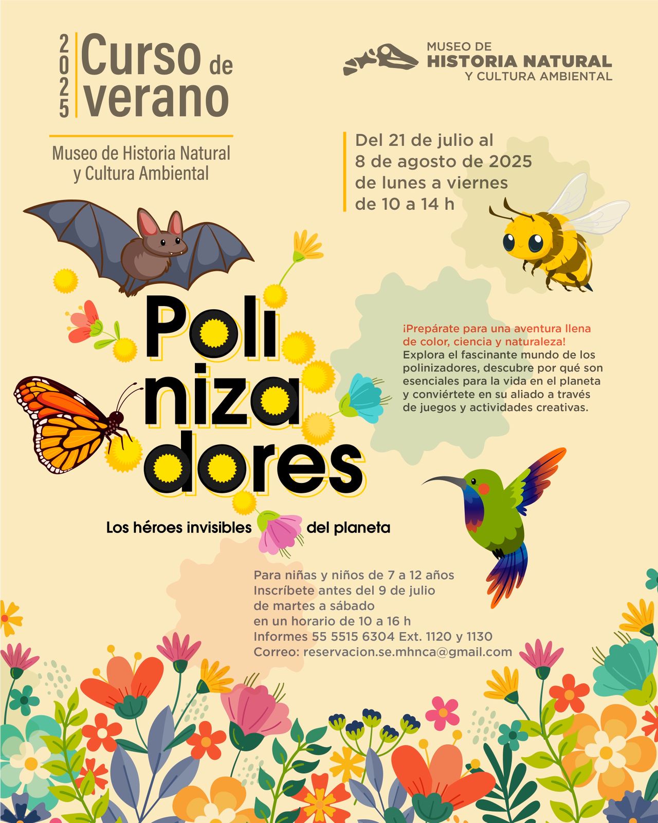 La Secretaría del Medio Ambiente (SEDEMA) de la Ciudad de México, a través de la Dirección General de Coordinación de Políticas y Cultura Ambiental (DGCPCA) y el Museo de Historia Natural y Cultura Ambiental (MHNCA), invita a madres, padres, tutoras y tutores a inscribir a las niñas y niños a la nueva edición del curso de verano del Museo de Historia Natural y Cultura Ambiental. En esta ocasión el tema es “Polinizadores: los héroes invisibles del planeta” y se llevará a cabo del lunes 21 de julio al viernes 8 de agosto, en un horario de 10:00 a 14:00 horas.