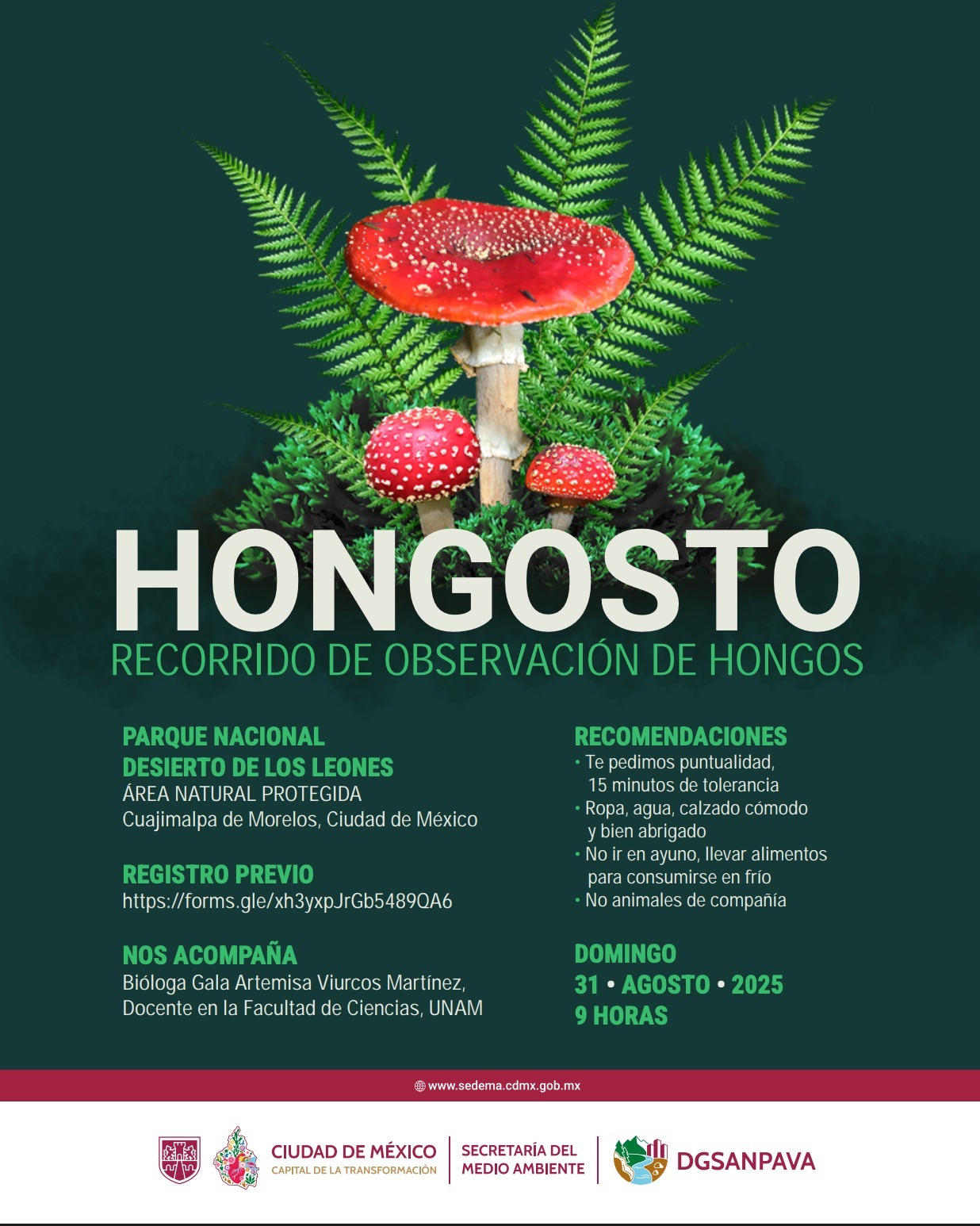 La Secretaría del Medio Ambiente (SEDEMA), a través de la Dirección General del Sistema de Áreas Naturales Protegidas y Áreas de Valor Ambiental (DGSANPAVA), invita a las y los habitantes de la Ciudad de México al recorrido de observación de hongos en el Área Natural Protegida Parque Nacional Desierto de los Leones el domingo 31 de agosto del 2025.