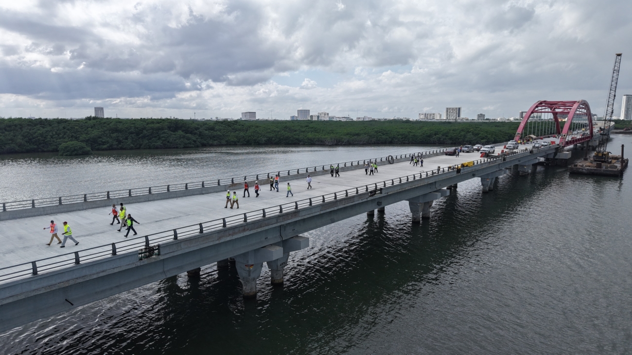 Esta emblemática obra que cruza el sistema lagunar Nichupté, será uno de los puentes más largos de América Latina sobre una laguna y servirá como ruta alterna en caso de emergencias o desastres naturales.