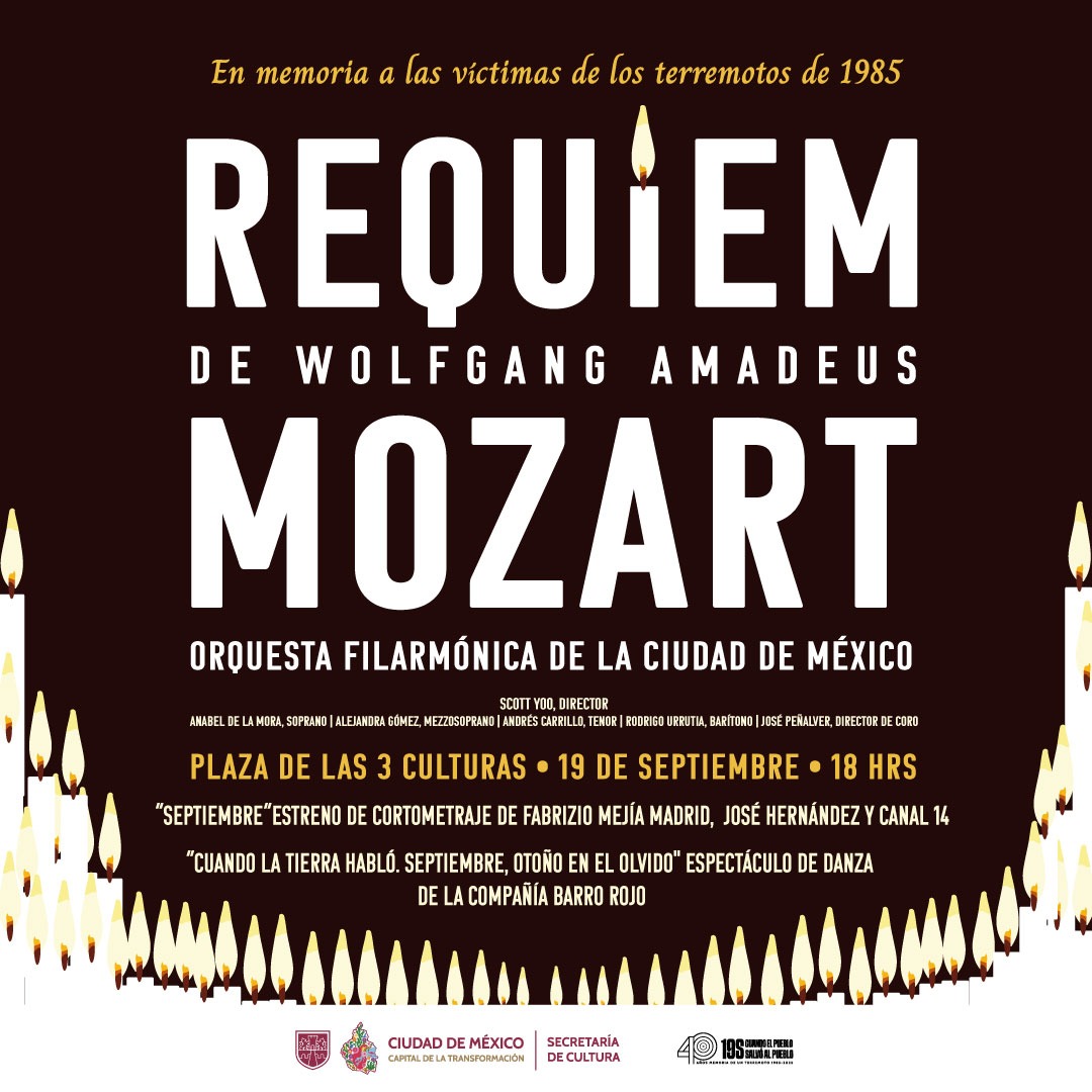 En el *40 aniversario del sismo ocurrido el 19 de septiembre de 1985* y para rendir homenaje a las víctimas de dicho suceso, la *Orquesta Filarmónica de la Ciudad de México*, agrupación perteneciente a la *Secretaría de Cultura capitalina*, interpretará _Réquiem_ de Mozart, en la Plaza de las Tres Culturas, en Tlatelolco, entrada libre. Además, la compañía Barro Rojo Arte Escénico ofrecerá un espectáculo de danza, a partir de las 18 horas del próximo viernes 19 de septiembre de 2025.