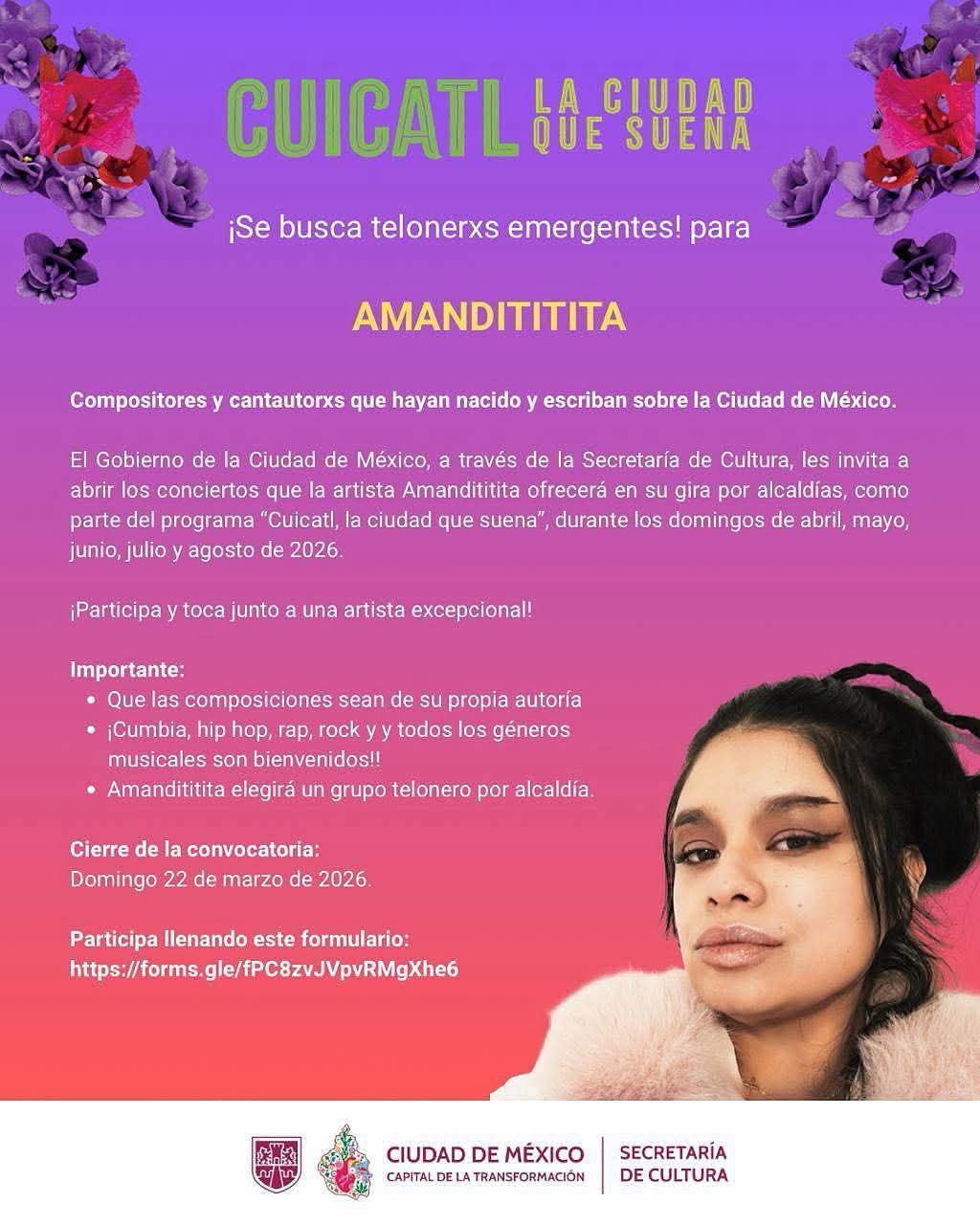 La Secretaría de Cultura de la Ciudad de México invita a compositoras, compositores, cantautoras y cantautores emergentes a participar en “Cuicatl: la ciudad que suena”, una iniciativa que busca visibilizar el talento local y brindar espacios de presentación a nuevas propuestas musicales. Las y los artistas seleccionados tendrán la oportunidad de presentarse como actos teloneros en los conciertos de entrada libre que la cantante Amandititita ofrecerá en distintas sedes de la ciudad, como parte de una gira que se llevará a cabo los domingos de abril, mayo, junio, julio y agosto de 2026.
